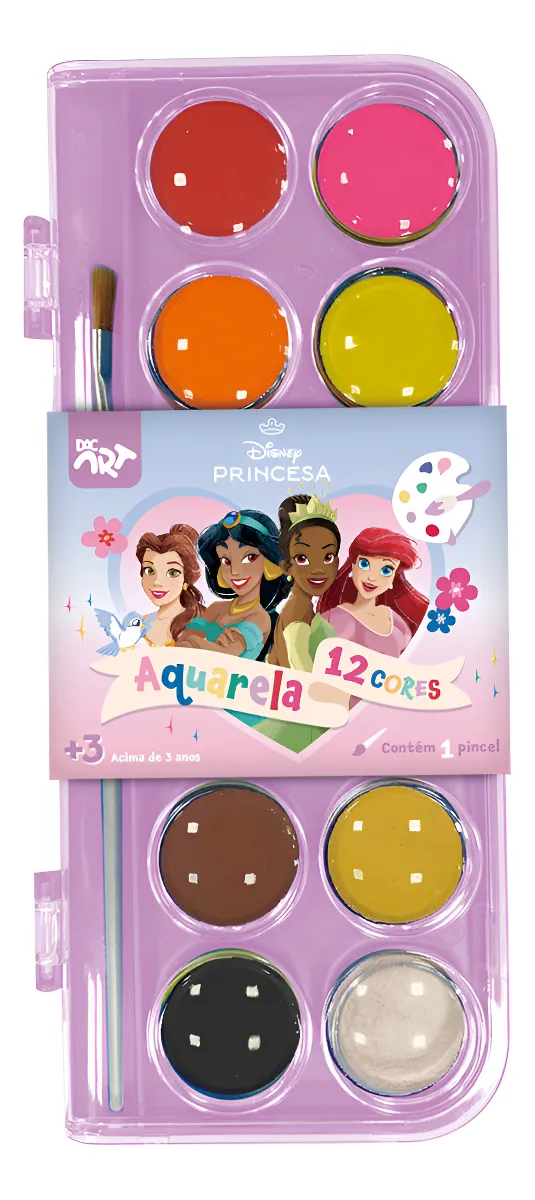 A Aquarela 12 Cores com Pincel Princesas é perfeita para despertar a criatividade e imaginação das crianças.