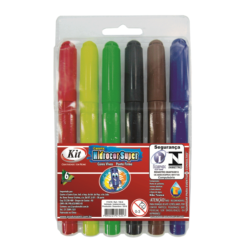 A Caneta Hidrocor Jumbo 6 Cores da KIT oferece traços firmes e com alta cobertura. Possui corpo grosso para melhor pegada, ponta resistente e tinta vibrante, garantindo desenhos nítidos e preenchimento uniforme. Ideal para atividades escolares, artísticas e recreativas, sendo perfeita para crianças em fase de aprendizagem motora.