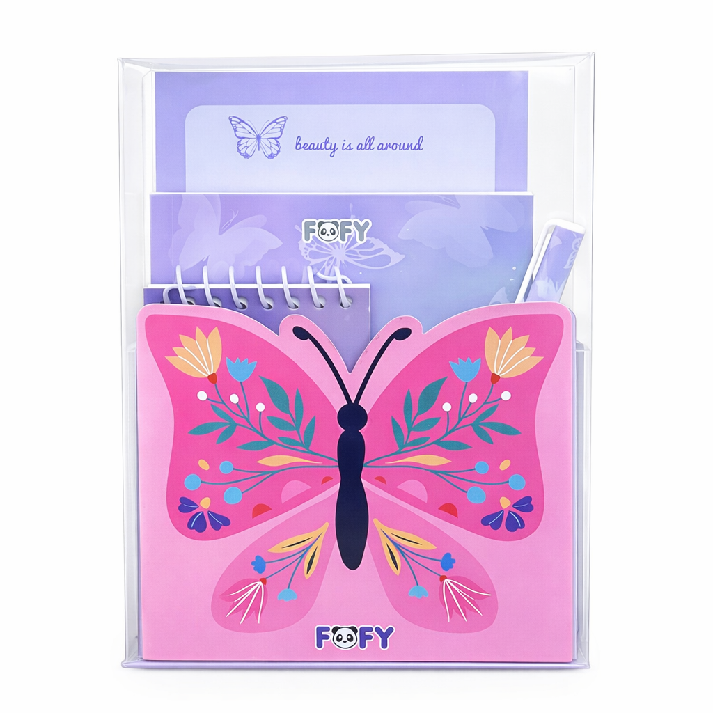 O Kit de Anotação Butterfly Spring FOFY com 4 itens é ideal para registrar ideias, recados e tarefas com praticidade e estilo. O conjunto inclui mini caderneta espiral, caneta e acessórios decorativos com tema de borboleta e primavera.