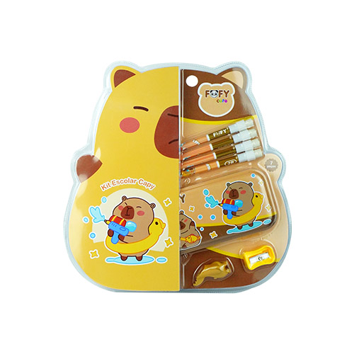 O Kit Escolar Capy FOFY é ideal para acompanhar o dia a dia escolar com praticidade e estilo. O conjunto inclui itens essenciais para escrita, desenho e organização, todos com design exclusivo da linha Capy, inspirado na capivara.
