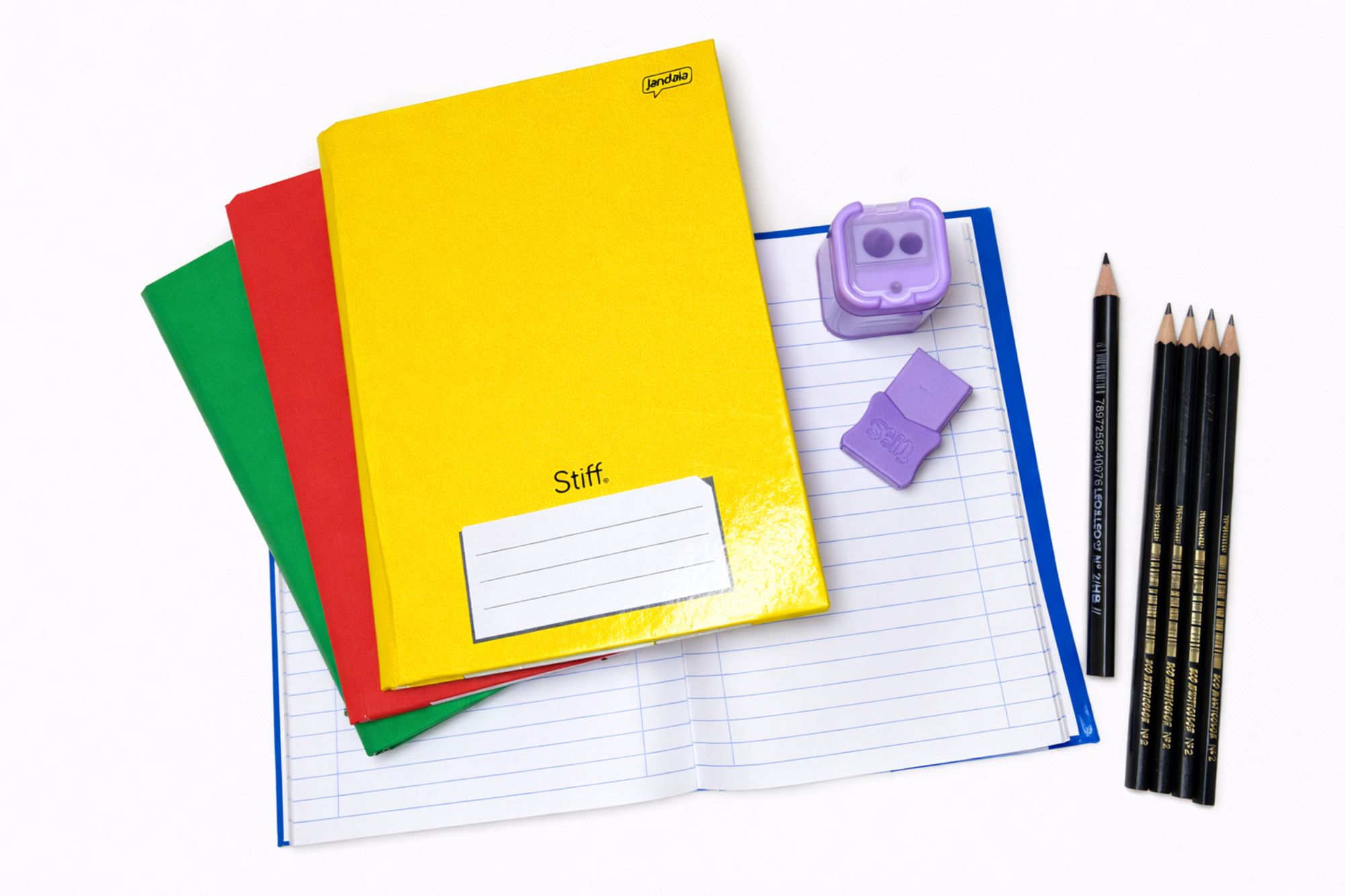 Além dos cadernos, o kit acompanha 4 lápis grafite multicolor N2, 1 lápis jumbo Leo & Leo, ideal para crianças em fase de aprendizagem, 1 borracha macia com capa plástica Tris, que protege e aumenta a durabilidade, e 1 apontador big duplo com coletor, prático e funcional para o dia a dia escolar.